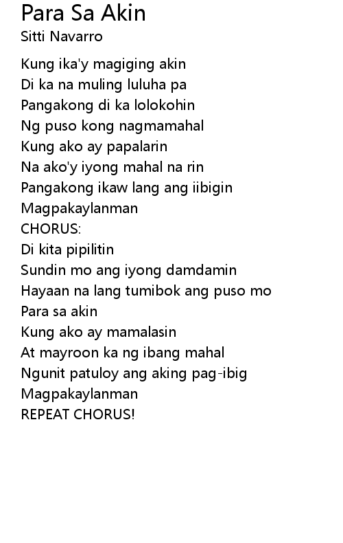 Para Sa Akin Sitti Navarro. Chorus Di kita pipilitin. Kung ikay magiging akin Di ka na muling luluha pa Pangakong di ka lolokohin Ng puso kong nagmamahal Kung ako ay papalarin Na akoy iyong mahal na rin Pangakong ikaw lang ang iibigin Magpakailanman Chorus Di kita pipilitin Sundin mo pang iyong damdamin Hayaan nalang tumibok ang puso mo Para sa akin Kung ako ay mamalasin At mayron ka nang ibang mahal.