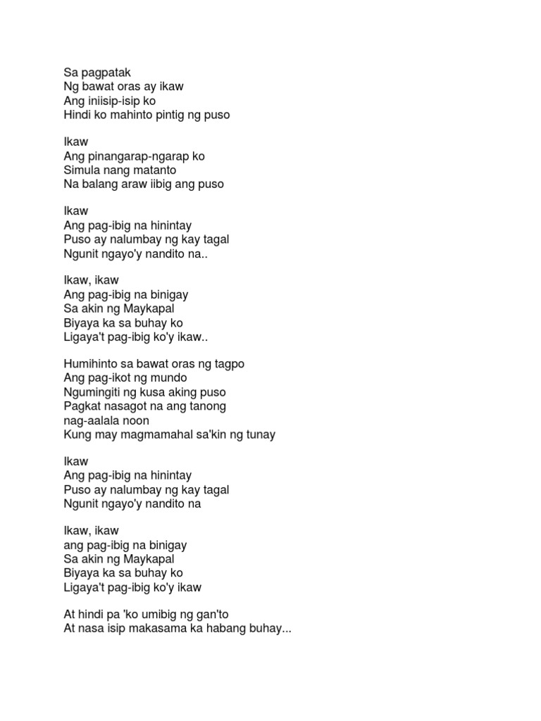 Di mo siguro alam Na lahat ng aking ginagaway para sayo Di mo siguro pansin Na lahat ng tagumpay Ay aking inaalay sayo Ikaw ang tanging minamahal. IKAW By Ric Manrique Intro Bm - - E - - A - - - - Verse A AM7 A AM7 Ikaw ang aking panaginip A A7 D Ikaw ang tibok ng dibdib Bm E Cm F Pusong humihibik dinggit umaawit Bm E A Tinataghoy ay pag-ibig Verse A AM7 A AM7 Ikaw ang ligaya sa buhay A A7 D Sa piling moy walang kamatayan Bm E Cm Puso koy nangumpisal sa. Submit lyrics correction.